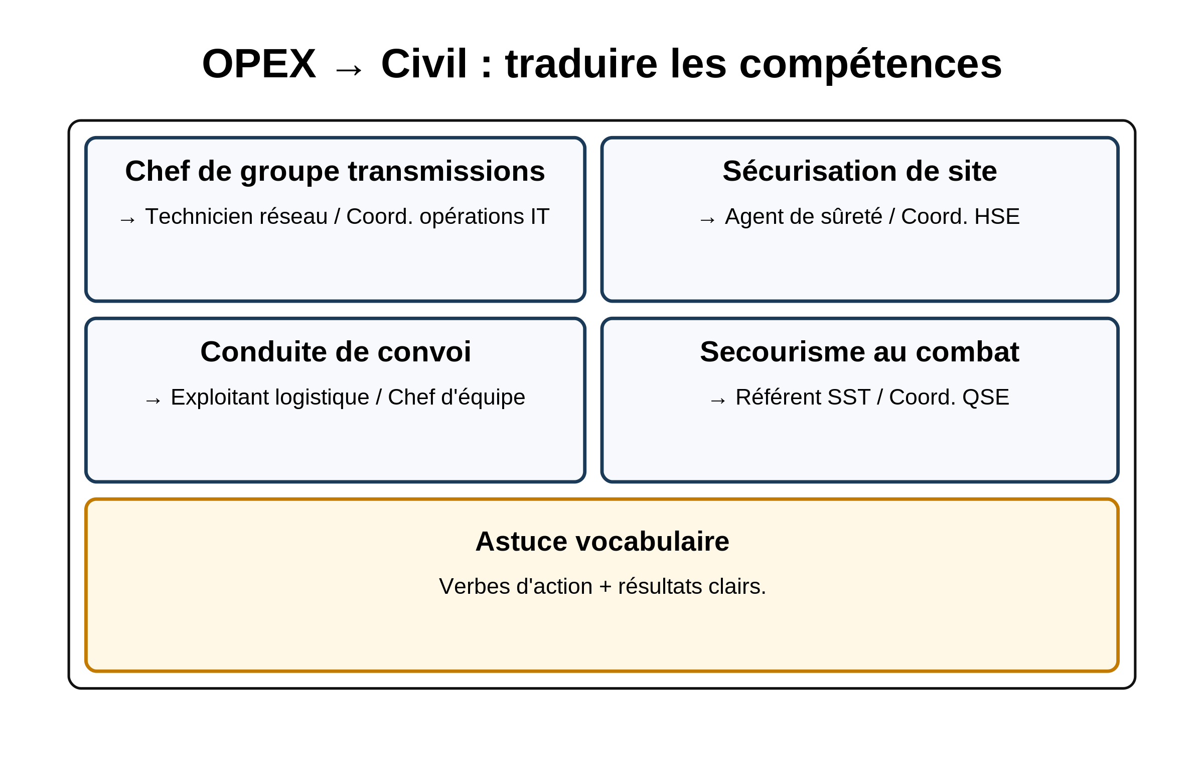Remplacez les termes strictement militaires par des rôles civils et des résultats : délais, qualité, sécurité, coûts. Exemple : traduire vos compétences militaires OPEX de « chef de groupe » en compétences réseau/IT mesurables.